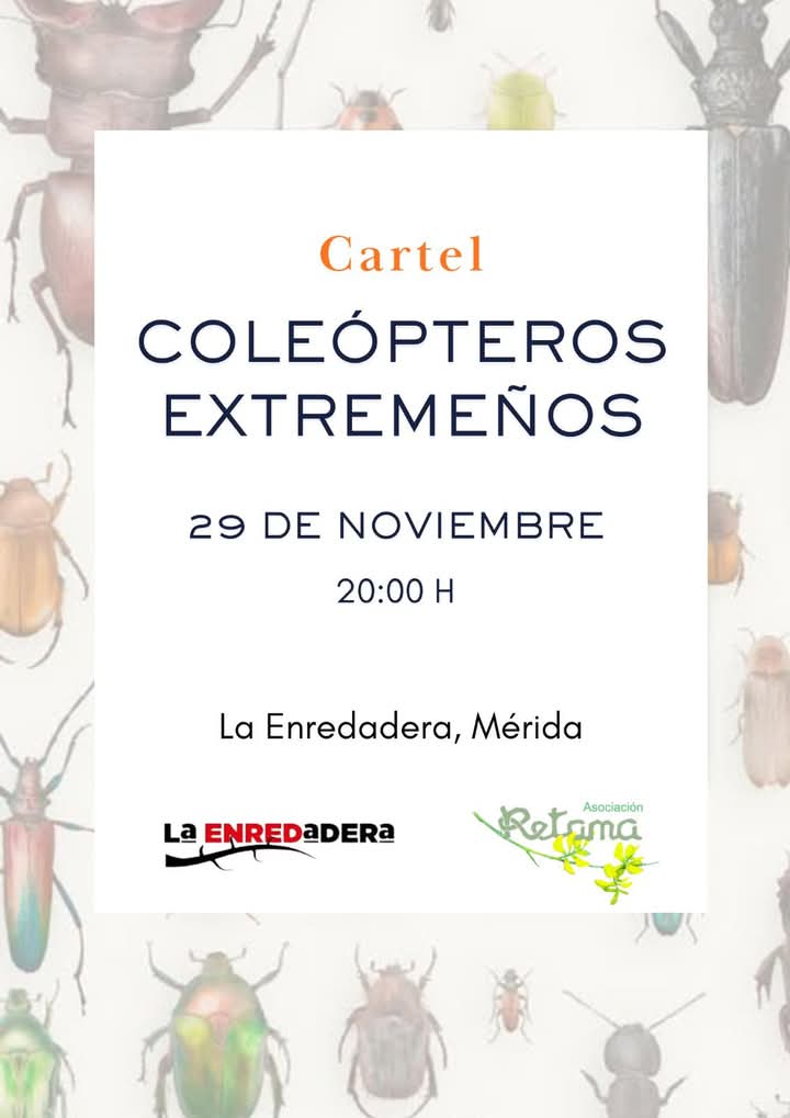 El sábado 29 de noviembre, a las 20:00, llenamos La Enredadera (Cimbrón, 1) de coleópteros extremeños. Manuel García presenta su cartel recopilatorio, una mezcla a partes iguales de arte, ciencia y naturaleza. Una obra con la pretensión de divulgar lo pequeño, lo misterioso, lo anónimo, lo importante. Nos contará Manuel el proceso creativo y, también, algo de los pequeños seres que llenan de vida la cartulina. Sí, es la presentación de un cartel, pero con él la de una parte misteriosa y diminuta del mundo que habitamos. Ven a pasar un buen rato, que luego siempre hay música y sus correspondientes cañas.