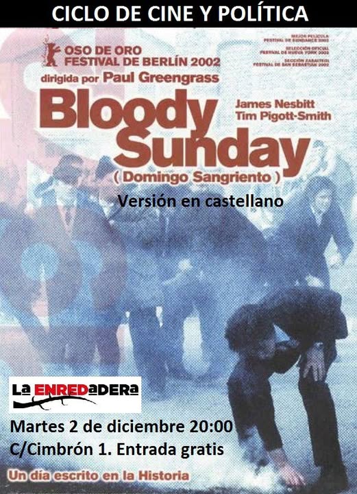 El II Ciclo de cine político y social de la Enredadera nos acerca a películas muy potentes y diferentes entre sí durante los próximos martes. La de este 2 de diciembre es una película increíble (en contenido y en forma), salvo porque está basada en hechos reales. Grabada con largas escenas en plano-secuencia, en los que no nos perdemos ni un detalle de lo que pasa. Una jornada de lucha social minuto a minuto. Pocas películas de corte político sobre un hecho histórico han conseguido ser tan fieles como Domingo sangriento. 30 de enero de 1972. Domingo. Londonderry, Irlanda del Norte. Está convocada una marcha por los derechos civiles, donde la población protesta contra la ley «antiterrorista» que incluye el encarcelamiento sin garantías jurídicas de los ciudadanos. El IRA ha prometido estarse quieto. Pero a pesar de su diálogo con las autoridades unionistas y sus tentativas de negociación con las fuerzas del orden británicas, nada sale bien. Lo que debía ser una jornada festiva, con la gente ejerciendo libremente su derecho a manifestarse, se va a convertir en un drama, por las balas disparadas por el ejército británico contra la población.