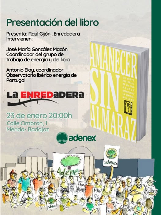 Este viernes 23 de enero, en La Enredadera de Mérida, presentamos Amanecer sin Almaraz, una publicación de Adenex que destapa el entramado de la energía nuclear en el Estado español y sus vínculos con los lobbies energéticos.