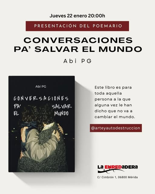 Te invitamos el próximo jueves 22 de enero a las 20:00 h a escuchar este recital en el que podrás adquirir un ejemplar de este nuevo poemario y/o postales y a enredarnos, soñar y crear ese nuevo mundo que nos gustaría vivir. En La Enredadera (Cimbrón, 1, Mérida).