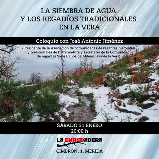 El próximo sábado, 31 de enero, a las 20:00, vamos a hablar de gestión popular del agua en La Enredadera (Cimbrón, 1, Mérida). Para ello, conoceremos el proyecto «Sembrando agua» de la mano de José Antonio Jiménez, con quien mantendremos un coloquio. José Antonio es el presidente de la Asociación de comunidades de regantes históricas y tradicionales de Extremadura y secretario de la Comunidad de regantes Siete Caños de Aldeanueva de la Vera.