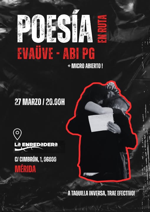 📌 Viernes 27 de Marzo/ 2026 🕣20h 🧭La Enredadera, Mérida. Recital taquilla inversa y micro abierto enredaderaextremena@gmail.com /// Unas valencianas plenas de creatividad y proyecto propio llegan a La Enredadera de la mano de una emeritense por el mundo, ABI, y acabarán su gira cargaítas de arte, con la poesía de evaüve @evauvee y Abi PG @abipg_ @arteyautodestruccion, que presenta su nuevo poemario «Conversaciones pa’ salvar el mundo», con la revolución en las palabras y la colectividad para sanar. Las acogemos en La Enredadera y abrimos el espacio participativo con micro abierto, para compartir arte y pensamientos. Si quieres apuntarte, envíanos un mensaje a enredaderaextremena@gmail.com o plántate y participa en el recital. Este es un evento-recital-micro abierto con arte y artesanía a taquilla inversa, porque el itiner-arte no tiene precio pero sí valor. Os esperamos con muchas ganas de expandir y compartir proyectos artísticos que se llaman REVOLUCIÓN y se apellidan TERNURA❤️🔥❤️🔥❤️🔥 Viernes 27 de Marzo/ 2026 a las 20h en La Enredadera, c/ Cimbrón 1, Mérida