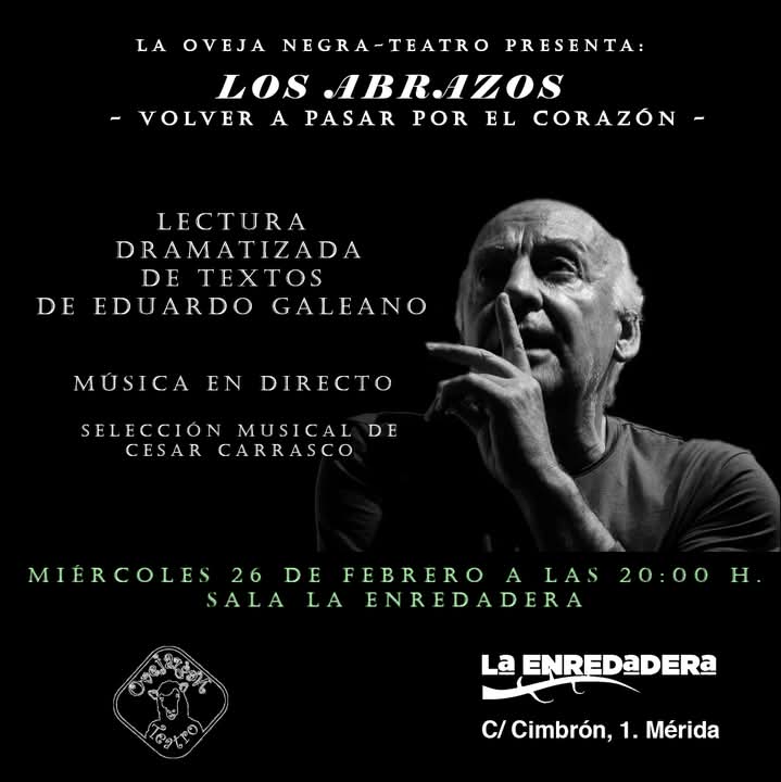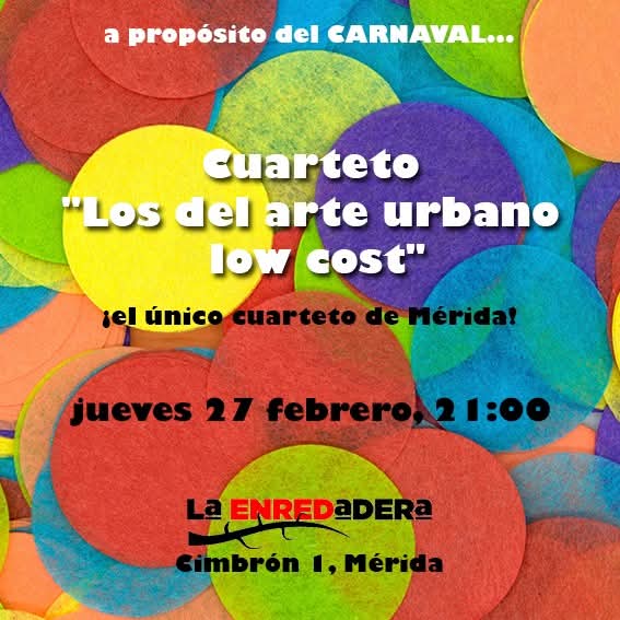 ¡Nos llega una semana que es puro arte! El martes 25, a las 19:00, poesía con Ángel Pla y su libro «Cartografía del olvido». El miércoles 26, a las 20:00, con La Oveja Negra-Teatro, Los abrazos-Volver a pasar por el corazón, lectura dramatizada de textos de Eduardo Galeano. Y para concluir, jueves 27 carnavalero con ¡el único cuarteto de Mérida!, «Los del arte urbano low cost», a las 21:00 horas.
