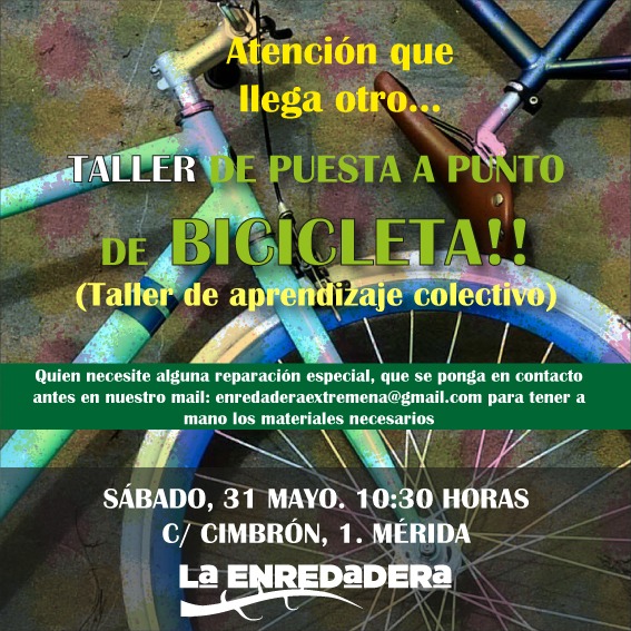 El 31 de MAYO, sábado, de 10:30 a 13:00, volvéis a tener en La Enredadera (Cimbrón, 1) nuestro/vuestro TALLER DE BICICLETA. Un proyecto autogestionado y colaborativo para aprender y enseñar a tener a punto estas máquinas mágicas. Vienes, enseñas, aprendes, reparas y sigues viendo el mundo mejor desde nuestras queridas dos ruedas. Quien necesite alguna reparación especial, que se ponga en contacto antes en nuestro mail (enredaderaextremena@gmail.com) para poder tener a mano los materiales necesarios. Ya sabéis donde estamos. Unas pedaladas y nos vemos.