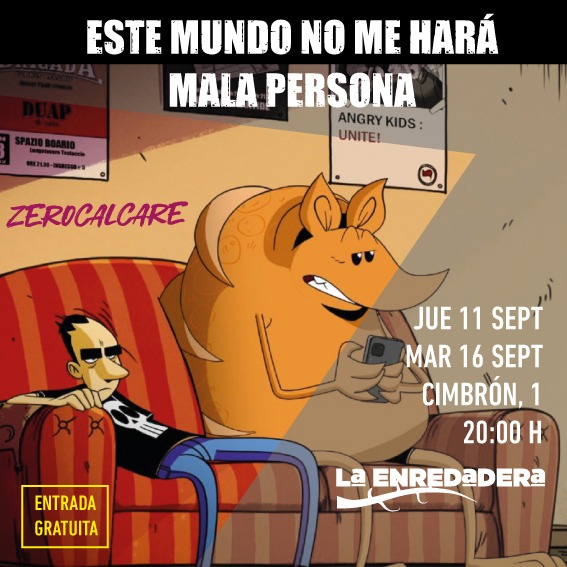 Para acabar un verano de animación, y como continuación de la aclamada “Cortar por la línea de puntos”, nos traemos a La Enredadera “Este mundo no me hará mala persona”. Proyectaremos sus seis capítulos en dos sesiones (jueves 11 y martes 16 de septiembre, a las 20:00) para, con Zerocalcare, volver a echar una mirada crítica sobre el fascismo, la vida cotidiana, la acción política, la inmigración o la amistad. Con una serie, dicen, que es de las mejores que jamás se hayan creado. Trabajo en 2D del de toda la vida, sensibilidad, buen hacer, sentido del humor y mala leche. Os esperamos en Cimbrón 1. Por supuesto, actividad gratuita.
