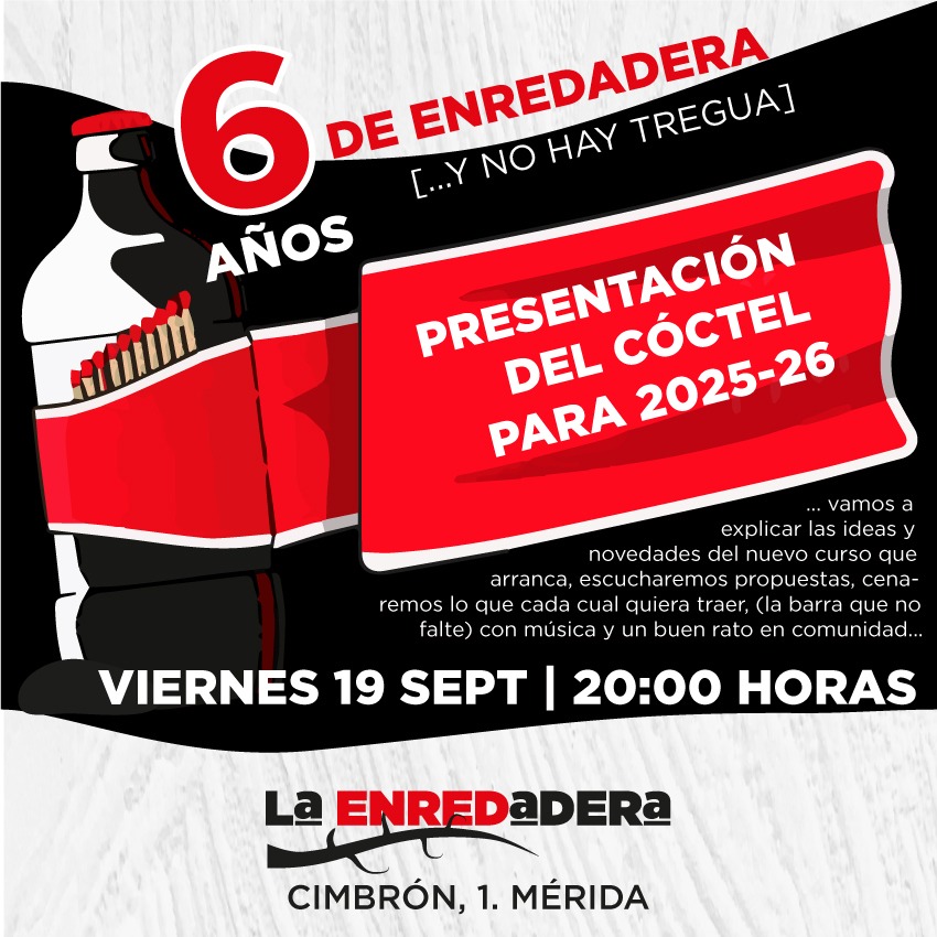 La Enredadera lleva en marcha ya más de seis años. Como hicimos hace 12 meses, nos hemos propuesto compartir balance de lo hecho y, a la vez, explicar nuestros proyectos inmediatos. También, cómo no, queremos recoger vuestras ideas. Volveremos a hacerlo del modo más festivo posible el próximo viernes, 19 de septiembre, a las 20:00 horas. Allí conoceremos el cóctel (inflamable, como siempre, que nos gustó tanto la metáfora que repetimos cartel con ella) de todo lo que se nos ha ocurrido para los meses venideros, de lo que continuamos y de lo que innovamos. De lo que seremos. Cenaremos lo que cada cual traiga y echaremos un buen rato en comunidad. Como decimos tantas veces, ya sabéis de qué va esto: debates, libros, contracultura , poesía, teatro, impro, micro abierto, biblioteca, exposiciones, talleres, bicis, música en vivo, cine, creación, contrainformación, rebeldías, amistad y lo que surja. Un espacio para no perderse… ¡o para perderse dentro! En Cimbrón, 1, su local alternativo de referencia.