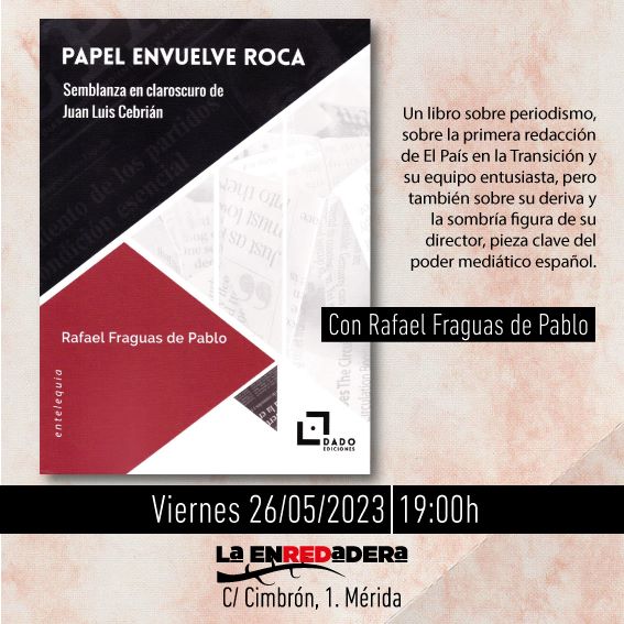 Presentación de Papel envuelve roca. Semblanza en claroscuro de Juan Luis Cebrián. Con su autor Rafael Fraguas de Pablo.