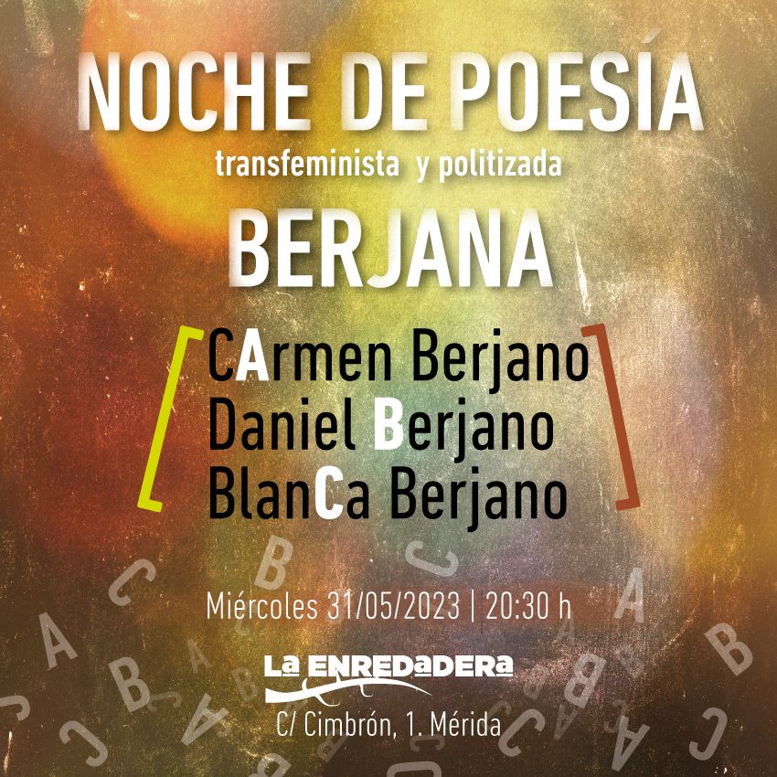 Una nueva apuesta: Noche de poesía transfeminista y politizada, leída por Carmen, Daniel y Blanca Berjano, tres primxs unidxs por su apellido y por su amor a la escritura y a la lectura. Carmen es artista plástica y de la palabra. Accésit en certamen internacional de poesía visual Juan Rosco. Trabaja facilitando talleres artísticos con diferentes colectivos, con el proyecto ArtEmoción y la acompañará a la guitarra Darío Agudo. Daniel investiga cuestiones de género, raza y clase en relación al cine y la identidad nacional, además de escribir poesía y canciones. Blanca es doctoranda, profesora y autora de tres poemarios. Su último libro, Rosario (editorial Valparaíso), está ubicado en Mérida y trata el tema del trauma intergeneracional a partir de la guerra civil española. En su obra, la voz y el cuerpo de la mujer cobran un papel esencial.Martes 31, a las 20:30, tiempo para la poesía en La Enredadera (calle Cimbrón, 1, de Mérida). Que nos hace buena falta.