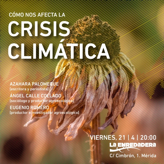 En mitad de una de las sequías más voraces de las últimas décadas, con las temperaturas desobedeciendo cualquier registro y frente a la sensación de que nos estamos asomando a algo con consecuencias a nivel planetario, queremos discutir acerca de cómo nos afecta la crisis climática. Y lo haremos en compañía de un plantel de lujo. Estarán en nuestro/vuestro espacio tres voces autorizadas, con conocimientos del problema, con experiencia sobre el terreno, con iniciativas, ideas y datos: Azahara Palomeque (escritora y periodista), Ángel Calle Collado (sociólogo y productor agroecológico) y Eugenio Romero (productor e investigador agroecológico).