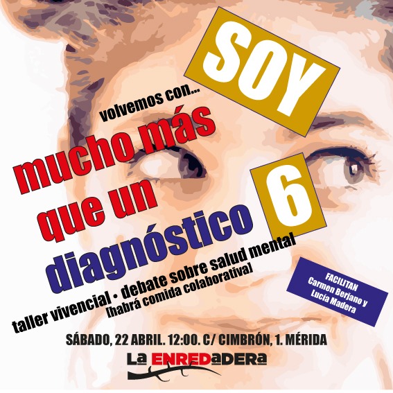 Iniciado en junio pasado con gran éxito de público, pero sobre todo de participación, desde entonces van varias ediciones cargadas de ideas, afecto, escucha y disenso con Lucía Madera, psicóloga enredada, y con Carmen Berjano, otra de las dinamizadoras del proyecto. Ya sabéis de qué va la trama: un taller vivencial sobre las claves de la salud mental para normalizar y eliminar estigmas. Lo dicho, el sábado 22 de abril, en La Enredadera, a las 12 del mediodía, reiniciamos la ruta de «Soy mucho más que un diagnóstico». Esta vez, como la última, con comida colaborativa. Cada cual, que traiga lo que desee, que lo compartiremos en común. Allí nos encontramos.