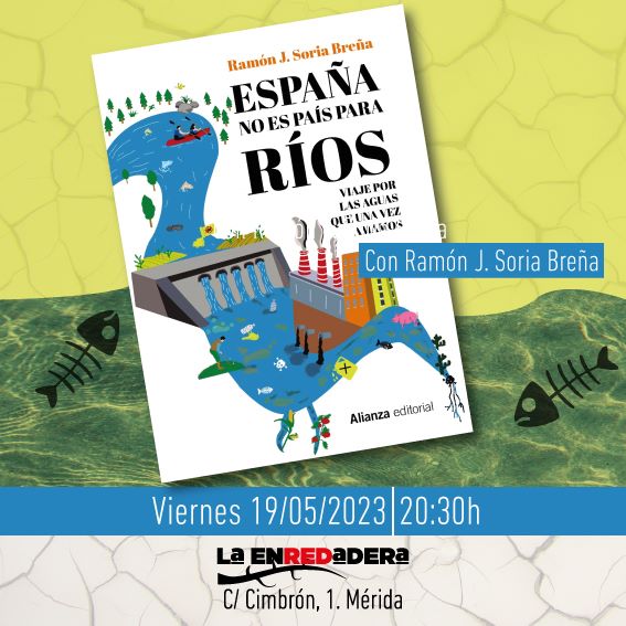 «España no es país para ríos» analiza la situación de cuarenta ríos de entre los cerca de treinta mil que recorren las tierras de nuestro país. Son cuarenta ríos que los representan a todos, porque los problemas que sufren nuestros ríos son comunes a todos ellos: los embalses que impiden la circulación y renovación de las aguas, la introducción destructiva de especies exóticas, la contaminación de la industria y del modelo agropecuario, su uso indiscriminado para generar energía y regar huertas inmensas…». Y de esto, con la guía de su obra y su experiencia, nos vino a hablar el 19 de mayo, Ramón J. Soria Breña a La Enredadera, en este mes que tanto hemos mirado al agua. Una oportunidad única para compartir con quien probablemente sea la persona que más y mejor se ha sabido aproximar a la sensibilidad de nuestros cauces (o de lo que un día fueron y aún pueden volver a ser).
