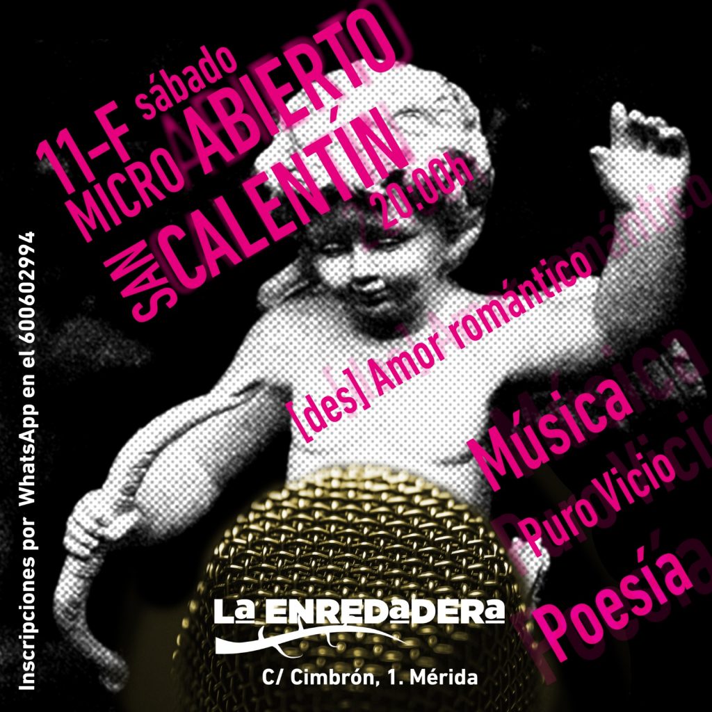 Inscribiros o venir a disfrutar del micro abierto del 11 de febrero, a las 20:00 horas en La Enredadera (C/ Cimbrón, 1). Irá el tema de sexo, amor, desamor, bajas pasiones, puro vicio, desespero, piel y gozo libertino y libertario. A saco.