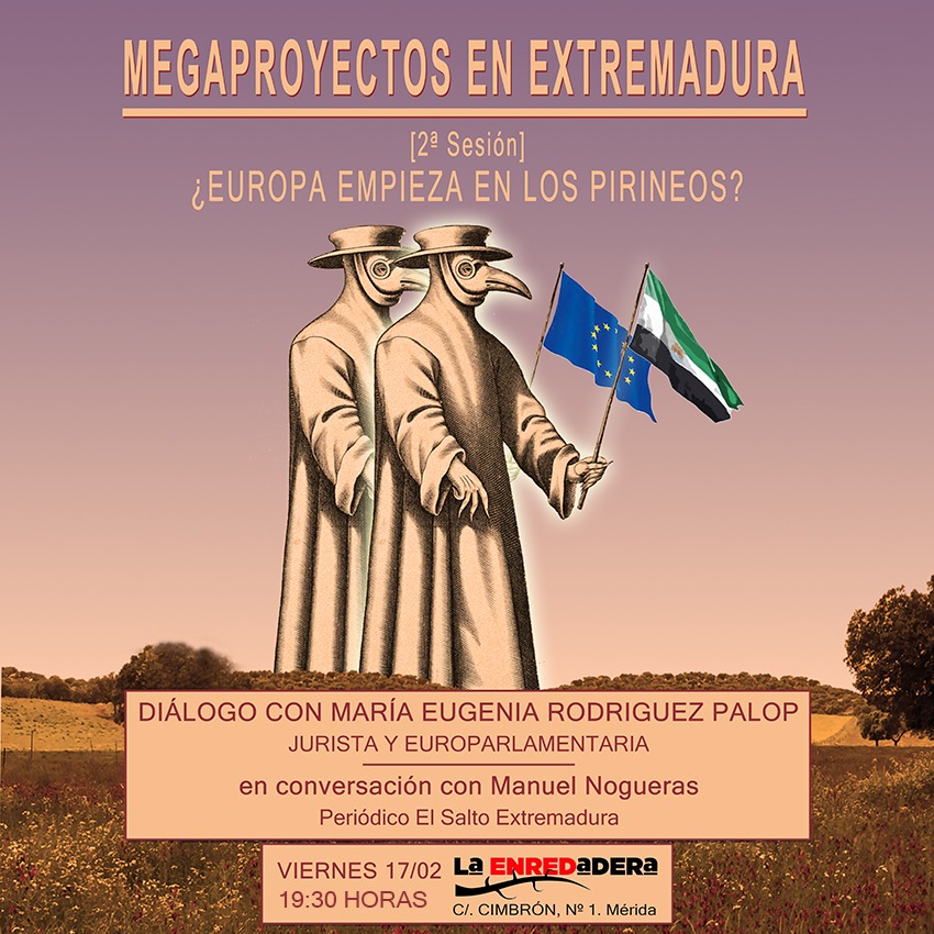Nos visita esta semana , de Llerena; europarlamentaria, jurista, profesora, investigadora y tantas cosas que es un lujo poder contar con ella. En diálogo con Manuel Nogueras, del periódico El Salto Extremadura, se intentará desgranar el papel de Europa en la política de megaproyectos, las posibilidades de la acción institucional en el marco de la UE, el papel de los lobbys, de la Administración autonómica… en este constante bombardeo, en esta fábrica de sueños. Desde Elysium City a Valdecañas, un recorrido simple e instructivo para orientarnos en este laberinto verde, circular, digital, descarbonizado ―o lo que sea―, que sofoca al territorio extremeño. Todo, el viernes 17 de febrero, a las 19:30 horas en la Enredadera (calle Cimbrón, 1, Mérida). Como para no perdérselo. Y de ahí, al carnaval, directas y directos.