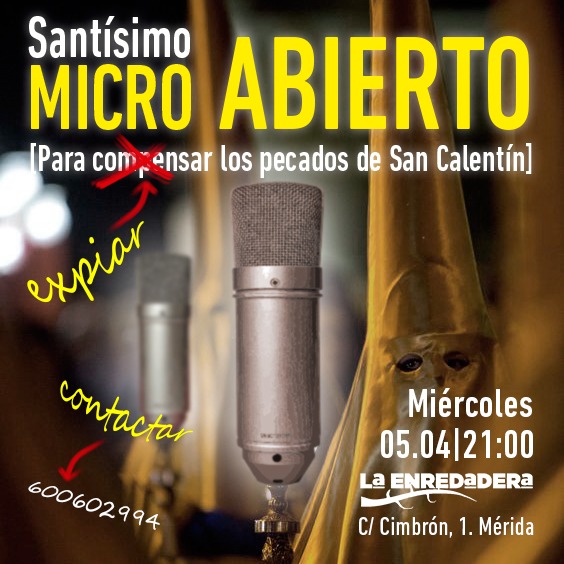 Tras los excesos de San Calentín, el micro de La Enredadera se pone al servicio de las bondadosas, misericordiosas y caritativas personas que quieran expiar sus pecados. ¡Arrepentidas las quiere Dios! En esta sacrosanta semana, vuelve el MICRO ABIERTO.
