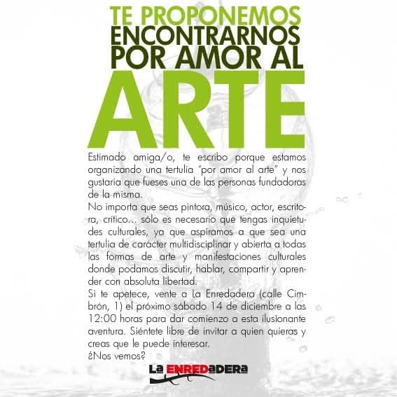 Este sábado tenemos una cita con el Arte. Nos vemos a las 12 y si te apetece y puedes, trae algo para compartir y hacemos comida colaborativa. Un abrazote
