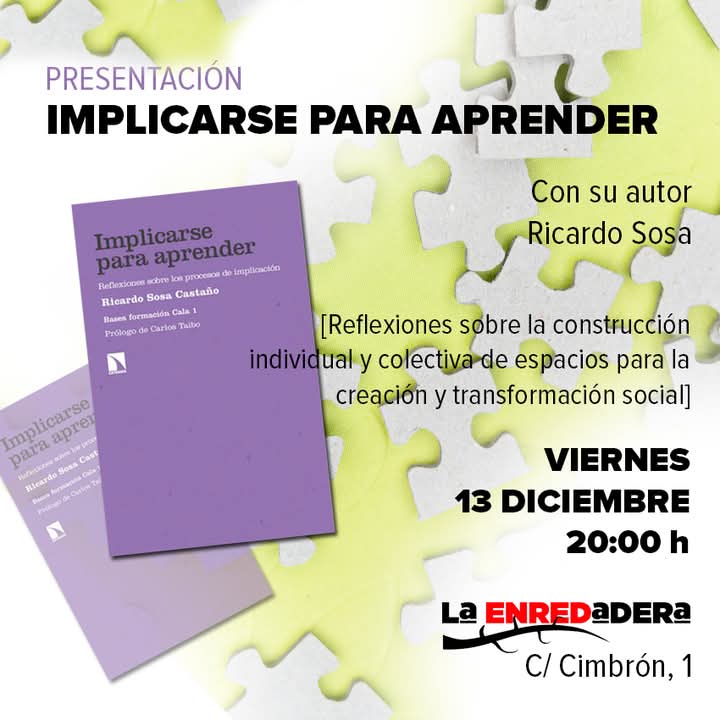 MAÑANA, 13 de diciembre, nos encontramos en la Enredadera con Ricardo Sosa Castaño, toda una vida dedicada a la reflexión y práctica de la educación como herramienta de transformación personal y colectiva, combinando la profunda vocación pedagógica con un compromiso ético que lo ha llevado a explorar nuevas formas de aprendizaje. Dialogaremos con él aprovechando la publicación de Implicarse para aprender, su libro, prorrogado por Carlos Taibo, con el que reflexionaremos sobre la construcción individual y colectiva de herramientas y espacios de transformación social. En este tiempo de mensajes reaccionarios y negacionistas, de retroceso en los proyectos de cambio, se hace más necesario que nunca detenerse para pensar, para respirar, para dedicar el tiempo necesario a la construcción reflexiva que nos ayude a resistir y, sobre todo, a crear. El viernes 13 de diciembre, a las 20:00 horas, estaremos en La Enredadera (Cimbrón, 1), recuerda.