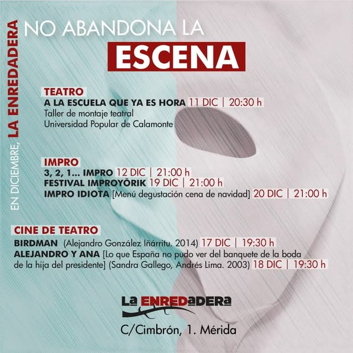 Este mes de diciembre, para combatir todos los fríos, nos calentamos con artes escénicas, una estupenda forma de crear comunidad. El MIÉRCOLES, 11, A LAS 20:30 (abriremos las puertas a las 20:00), el Taller de Montaje Teatral de la Universidad Popular de Calamonte nos trae A LA ESCUELA QUE YA ES HORA, con versión y dirección de María José Guerrero. El JUEVES, 12, A LAS 21:00, 3, 2, 1… ¡IMPRO!, una sesión colectiva de gimnasia para el ingenio y la risa. Después, el 17 y 18, CINE DE TEATRO. EL martes, BIRDMAN (una película formidable alrededor del teatro) y el miércoles la imperdible ALEJANDRO Y ANA (Lo que España no pudo ver del banquete de la boda de la hija del presidente), una crítica descarnada de nuestras élites políticas a cargo de Animalario. Teatro filmado para ser visto y disfrutado. El 19, JUEVES, a las 21:00, vuelve la improvisación con IMPRO YÖRIK y concluimos el VIERNES, 20, a las 21:00, con IMPRO IDIOTA y su Menú de degustación de cena de Navidad. ¡Venirse que todo merecerá mucho la pena!