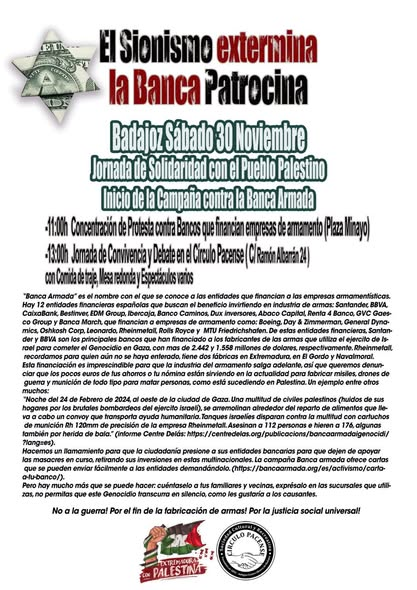 Este sábado, ya sabéis lo que hay por la mañana en Badajoz… Una denuncia del papel de la Banca en la industria armamentística y la matanza de Gaza. A las 11:00 horas, en la plaza Minayo.
