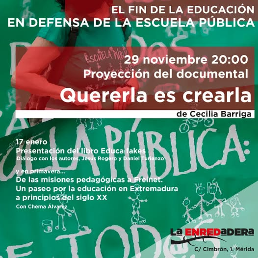 HOY, viernes 29 de noviembre, a las 20:00, retomamos el ciclo EN DEFENSA DE LA ESCUELA PÚBLICA. Lo hacemos con la proyección del documental de Cecilia Barriga, QUERERLA ES CREARLA, donde se aborda el sentido profundamente humano de la educación inclusiva y la necesidad de generar un movimiento social que la haga realidad. Este trabajo se enmarca en el proyecto del mismo nombre que aboga por un sistema educativo basado en la inclusión y la equidad, una iniciativa avalada por décadas de investigación que sostiene que legalmente estamos obligados a adecuar el sistema a la inclusión, usando este tipo de creaciones para desarrollar una verdadera educación inclusiva. Para verlo y comentarlo en comunidad, os esperamos en La Enredadera (C/ Cimbrón, 1, de Mérida).