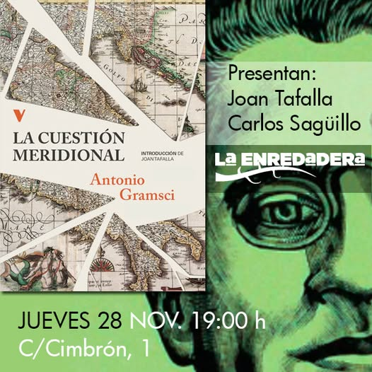 MAÑANA JUEVES, 28 de noviembre, a las 19:00 horas, traemos a Gramsci a La Enredadera (Cimbrón, 1, Mérida). De la mano de Joan Tafalla, y presentado por Carlos Sagüillo, abordaremos la edición de Verso Books de uno de los clásicos de la reflexión marxista: EL PROBLEMA MERIDIONAL. La obra de Gramsci retuerce, en el mejor sentido de la palabra, el pensamiento de Marx y de los socialistas italianos de su tiempo para llevarlo a su propia experiencia y territorialidad. Como sardo y comunista, Gramsci piensa el mundo desde un territorio periférico como es el sur europeo. Por ello, es uno de los pensadores clave para repensar el colonialismo interno en Europa occidental, en su sur, los procesos revolucionarios en territorios rurales y agrarios y las formas de capitalismo periférico en los márgenes del continente. Imprescindible para una mirada disidente desde Extremadura.
