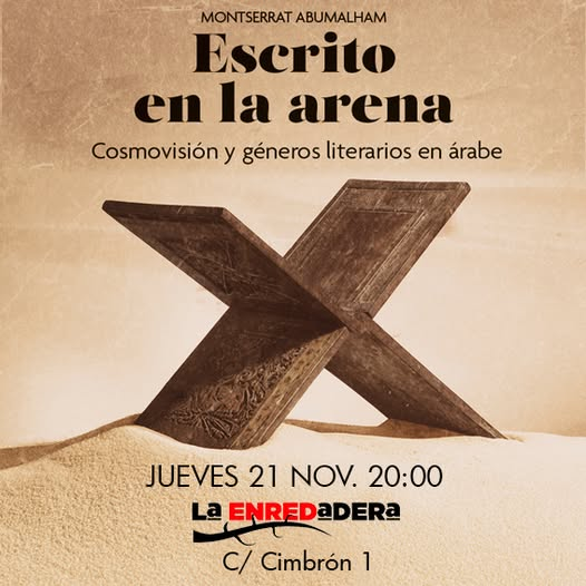 Y MAÑANA, una aproximación a la literatura árabe… ESCRITO EN LA ARENA es una muy peculiar historia de la literatura árabe que no se ordena según los criterios habituales de esta clase de estudios. No son los modos literarios, esto es, la expresión en verso, en prosa o en prosa rimada, los que organizan el acercamiento de Montserrat Abumalham a la literatura árabe. Pero tampoco es la división por épocas, períodos, dinastías o grupos eminentes de escritores, conforme a los patrones historicistas al uso, la que da sentido a la exposición de las piezas y obras literarias que comparecen en este libro. Son los géneros –proverbial, amoroso, religioso, etc.– los que constituyen su centro de gravedad, pues solo a partir de ellos puede rastrearse un sentido particular de la estética, una seña de identidad de la literatura árabe, que permanece a lo largo de los siglos y que incluso es anterior al surgimiento del islam. No estamos, por tanto, frente a un mero catálogo de obras, autores o periodos, sino ante un libro animado por una tesis robusta, defendida con gran solvencia intelectual, que afirma sin aspavientos la continuidad y personalidad propias de la literatura árabe. Si esta se escribe en la arena como metafóricamente dice el título, es porque en ella lo permanente sobrevive a lo efímero, de lo que sin embargo se nutre. Pero también porque sus orígenes se hallan envueltos en la niebla de un tiempo sin escritura. MAÑANA Jueves, 21 de noviembre. 20:00 horas
