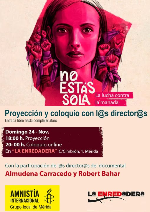 EL DOMINGO, 24 de NOVIEMBRE, Amnistía Internacional trae a La Enredadera el documental No estás sola. La lucha contra La Manada. La proyección comenzará a las 18:00 horas y tras su conclusión, a las 20:00 horas, se iniciará un coloquio con el director y directora del mismo, Robert Bahar y Almudena Carracedo. La película va entretejiendo el relato de la agresión sexual de La Manada y dos historias más, arrojando luz sobre la violencia sexual que viven las mujeres a diario hasta llegar al #MeToo español: momento en el que un millón de mujeres y jóvenes toman las calles al grito de «Hermana, yo sí te creo» y rompen el silencio en las redes con #Cuéntalo.