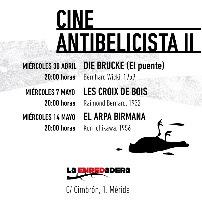 Cuando soplan vientos de guerra, en La Enredadera intentamos traer algo de reflexión, y lo hacemos de la mano de un cine inolvidable. Llegan tres películas formidables, clásicos antibelicistas fuera de circuitos comerciales y que, por calidad cinematográfica y por su mensaje no han perdido vigencia. Para espíritus pacificados, para antimilitaristas, para amantes de un cine difícil de encontrar, traemos a nuestra pantalla grande la oportunidad de ver DIE BRUCKE (El puente), de Bernhard Wicki (miércoles, 30 de abril, 20:00 horas), LES CROIX DE BOIS (Las cruces de madera), de Raimond Bernard (miércoles, 7 de mayo, 20:00 horas) y EL ARPA BIRMANA, de Kon Ichikawa (miércoles, 14 de mayo, 20:00 horas). Calidad artística, mensaje, imágenes del dolor y también de la esperanza. Estamos donde siempre, en Cimbrón 1, de Mérida.