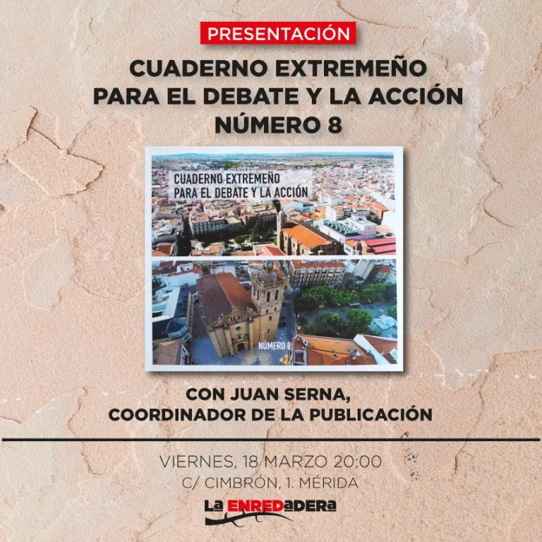 Los Cuadernos Extremeños para la el Debate y la Acción ya visitaron La Enredadera cuando estaban empezando, antes de pandemias y desastres varios. Ahora, con 8 ediciones a sus espaldas, vuelven para contarnos como va el proyecto, de qué nos habla su último número y cuáles son sus perspectivas de futuro inmediatas. Todo, de la mano de Juan Serna, coordinador del asunto. Para charlar de Extremadura y de realidades extremeñas, este viernes, a las 20:00, nos volvemos a encontrar en La Enredadera (C/ Cimbrón, 1 de Mérida). Os esperamos.
