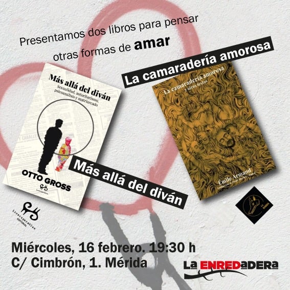 En las peligrosas proximidades del amenazante y comercial San Valentín, ese titán del amor romántico, nada mejor que conocer un par de textos clásicos, de esos que cuestionan todo, a través de sus reediciones. De la mano de las editoriales Irrecuperables y La Rabia, que nos explicarán el cómo y por qué de esos libros, el 16 de febrero, miércoles, en La Enredadera (calle Cimbrón, número 1), a las 19:30 horas, nos juntamos a escuchar y opinar sobre otras formas de amar.