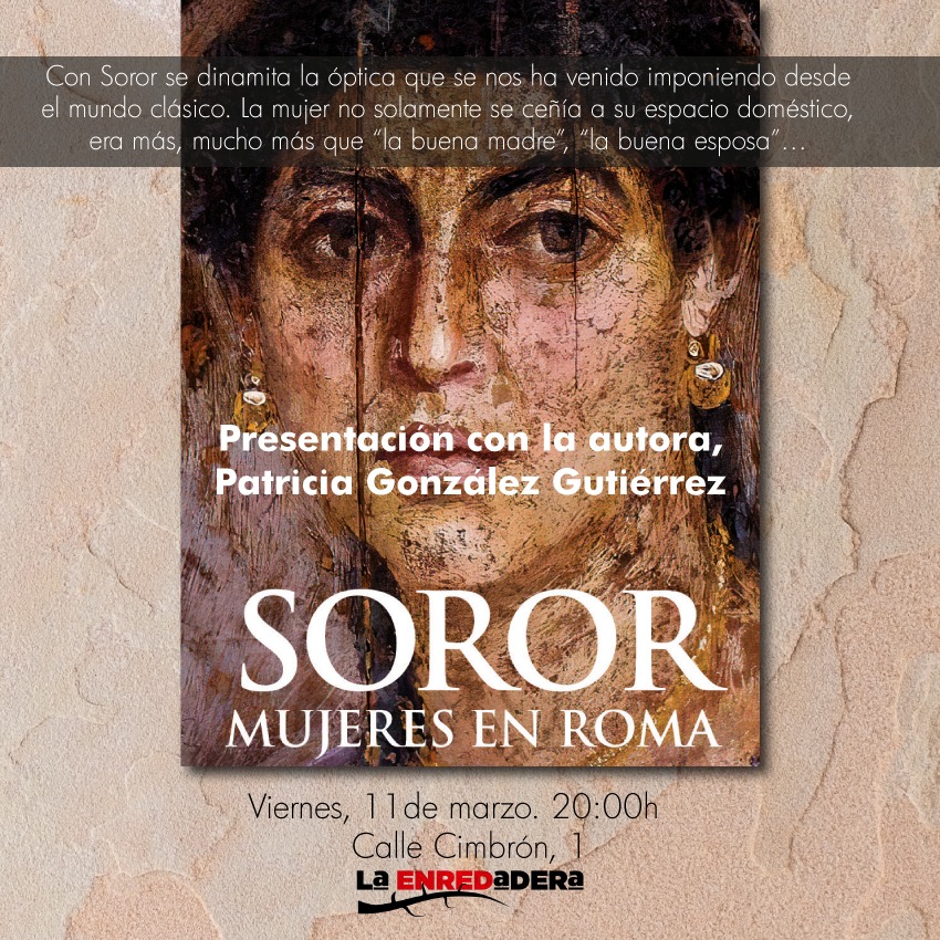 Alguien dijo que “La Historia la escriben los vencedores”… pero igual hay que ir más lejos para afirmar que “la Historia la han escrito los hombres”. Así, en el contexto de la celebración del Día Internacional de la Mujer (8 de marzo) queremos presentar una obra científica y de divulgación sobre la condición de la mujer en el tiempo, aunque centrada en la Roma antigua. «Soror. Mujeres en Roma» viene a nuestro espacio de la mano de su autora, la doctora en Historia y especialista en temas de Género Patricia González Gutiérrez. Escucharemos y aprenderemos, combatiremos estereotipos y destaparemos mentiras históricas. Todo eso en La Enredadera, el viernes 11 de marzo, a las 20:00 horas. Un buen plan.