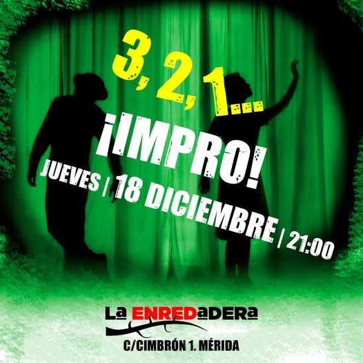 3, 2, 1… ¡¡¡IMPRO!!! de diciembre, la última sesión otoñal (¿primera del invierno? ya está en el disparadero de La Enredadera. Será el JUEVES 18, a la 21:00 h . Combate el frío y el aburrimiento, resístete a lo establecido e improvisa desde la comunidad y la alegría. Te repetimos lo de siempre: si lo conoces, repites, y si no has venido nunca, no te arrepentirás. ¡Juego, humor, teatro repentino, risas instantáneas!