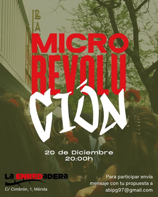 El día 20 de Diciembre a las 20:00h os esperamos en la Enredadera de Mérida (Cimbrón 1) para crear esta MICRO-REVOLUCIÓN. Si quieres unirte a compartir tu arte y participar con música, poesía, monólogo, performance… ponte en contacto con @abipg_ o enviando un mail a abipg97@gmail.com