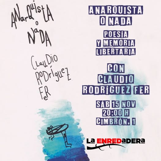 El 15 de noviembre, sábado, a las 20:00, tenemos en La Enredadera poesía de la buena. Nos visita Claudio Rodríguez Fer, escritor, poeta, narrador, dramaturgo, ensayista en lengua gallega e hispanista en lengua castellana. Su obra ha sido objeto de estudio en varios libros y está traducida a diversos idiomas en antologías y revistas de lenguas románicas, germánicas, eslavas y orientales. Avalado por diferentes premios, entre los que destacan el Premio de la Crítica Española por _Tigres de ternura_ y, por dos veces, el Premio Losada Diéguez, su recorrido poético ha tenido siempre presente la reivindicación de la memoria, la justicia y la dignidad. Viene a nuestro espacio a ofrecernos su obra bajo el sugerente título de “Anarquía o nada. Poesía y memoria libertaria”. Venir a conocer su voz, venir a compartir la comunidad de la reivindicación poética.