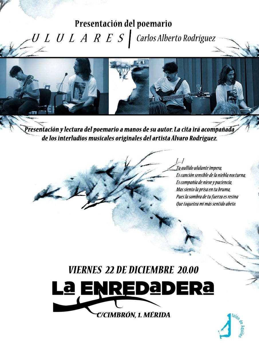 Este viernes 22 de diciembre a las 20:00 tendrá lugar en La Enredadera, la presentación y lectura del poemario ilustrado “Ululares” a manos de su autor, natural de Mérida, Carlos Alberto Rodríguez, joven poeta de 31 años. La lectura irá acompañada de la música en directo del música Álvaro Rodriguez.
