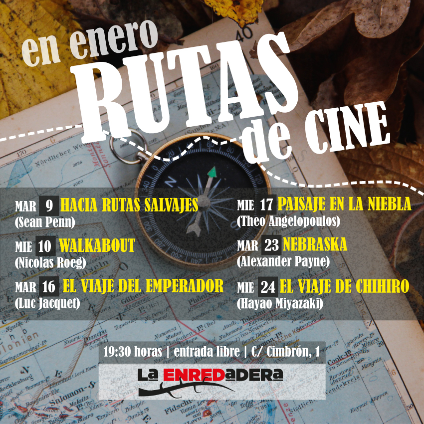 En este enero donde se intensifica el frío y, a la vez, se alargan las horas de luz, os proponemos un viaje de cine en La Enredadera. Formularemos en vuestra compañía la promesa de un primavera aún lejana pero cargada de caminos posibles. Veremos Hacia rutas salvajes y la Alaska ensoñada y difícil de un personaje indescriptible, acompañaremos a unos niños en el desierto australiano con Walkabout o a un pingüino en El viaje del emperador; recorreremos (de nuevo con la infancia de la mano) los Balcanes y su Paisaje en la niebla para pasar a otro tipo de travesía en la inolvidable Nebraska de blanco y negro. El viaje de Chihiro nos depositará al final del sendero con una auténtica obra maestra de la animación. Los días 9, 10, 16, 17, 23 y 24 de enero, a las 19:30, en la pantalla blanca y cooperativa de La Enredadera (Cimbrón, 1, Mérida). La mejor de las rutas es aquella compartida. Se os espera.