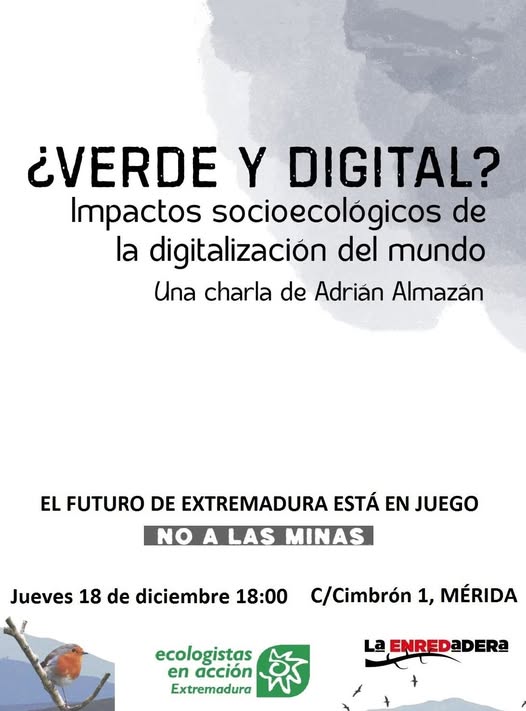 Pero además este proceso tiene un tremendo coste no sólo social o psicológico sino ecológico: la minería extractivista que devasta el territorio desde la montaña de Cáceres a Latinoamérica o África para extraer minerales como el litio. Así como la contaminación que esto genera y la cantidad de agua y otros recursos finitos que se sacrifican para hacer posible este modelo de vida que sólo beneficia a unos pocos. Adrián Almazán es experto en estas cuestiones y estos días viene a Extremadura para explicar las consecuencias de la digitalización de la sociedad. El jueves estará en Mérida (en la Enredadera), a las 18:00, y el viernes y sábado en Gata y Hervás.